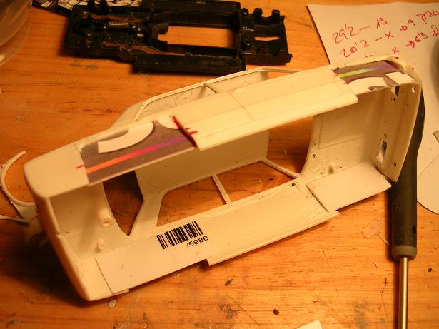 Si os fijais en las fotos , se ve que tras las farolas supletorias, hay 5 bujeros de ventilación, y un relieve de la chapa del que carece el altayero, con esos pasos de rueda solo faltaba que se pararan es esas trivialidades...Tapamos las entradas originales, y con ayuda de un cutter y una regla, hacemos una raya donde irían los centros de los agujeros, para que nos haga de guía y queden alineados, luego medimos y marcamos con un rotulador. Para que los agujeros queden alargados y regulares de tamaño, con una broca de 1mm, hacemos un agujero al lado del otro, eliminando luego el puente central con la misma broca y algo de cuidado.